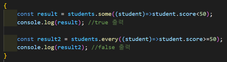 그리고 첫번째 Student 오브젝트로 인해 모든 배열 요소의 score이 50이상을 만족할 수 없어서 every( )는 false를 반환한다.