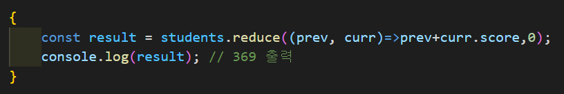 이전값인 prev의 초기값을 0으로 설정했다. 그리고 prev(이전값)+curr.score(이후값) 을 return해줌으로써 이를 다음 prev값으로 설정했다. 따라서 0 + 45 + 80 + 90 + 66 + 88 = 369 가 반환된다.