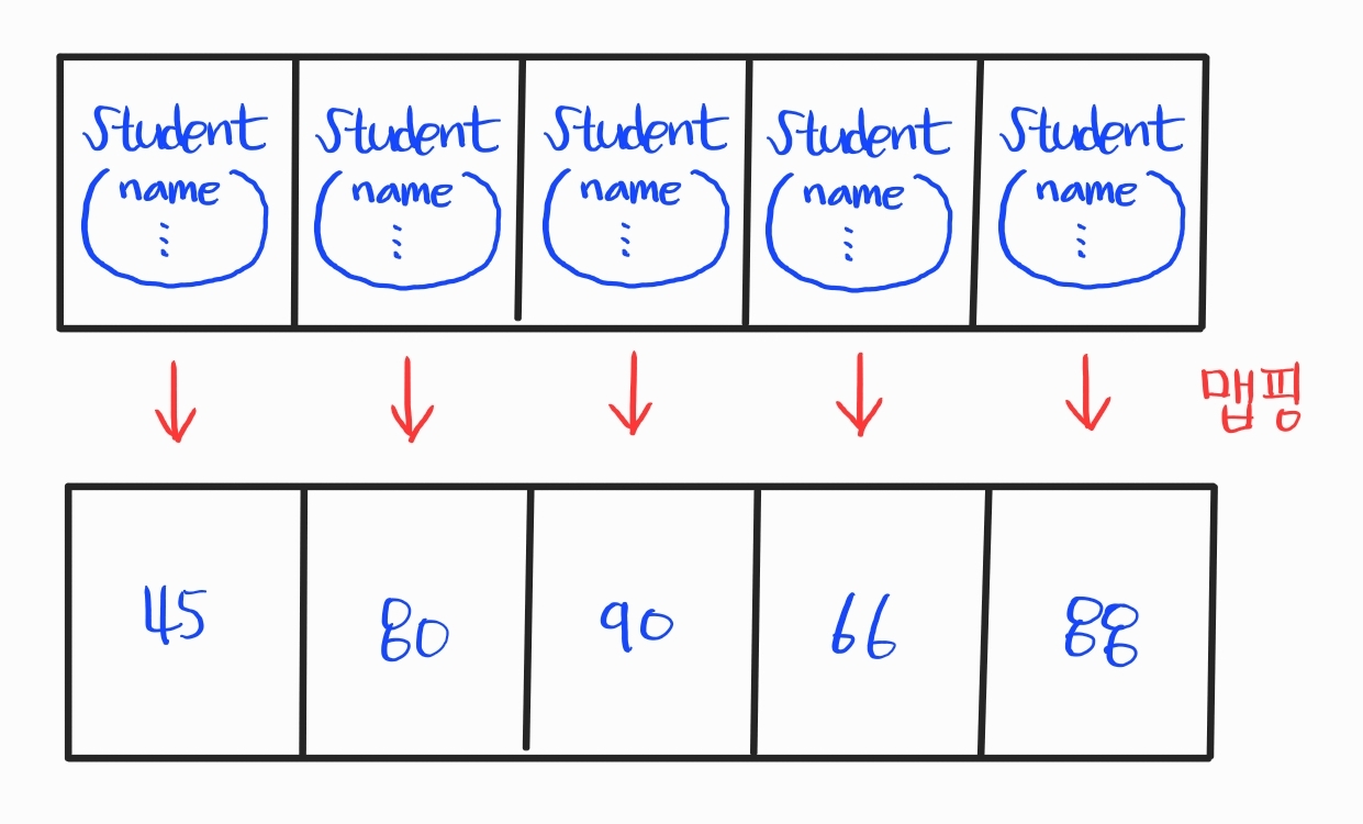 students의 모든 배열 요소가 (student) => student.score 콜백함수를 통해서 return값인 student.score로 맵핑된다.