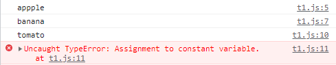 하지만 const로 선언한 변수 vegetable의 경우는 값을 변경하니 error가 발생한다.