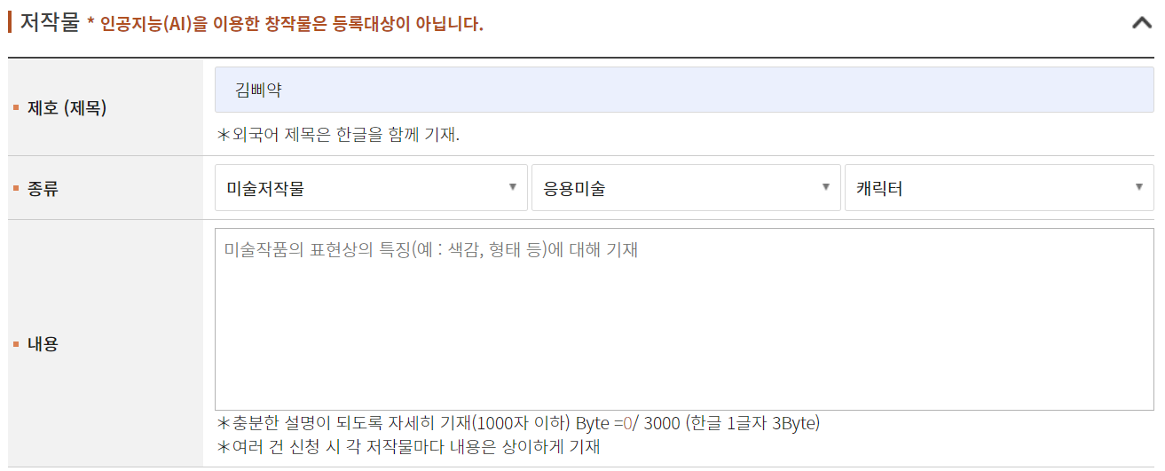 종류는 미술저작물 > 응용미술 > 캐릭터로 선택한 후,