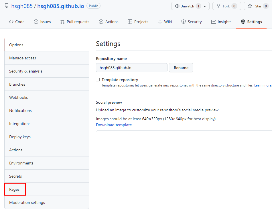 6. Settings창에서 Pages를 클릭한다.